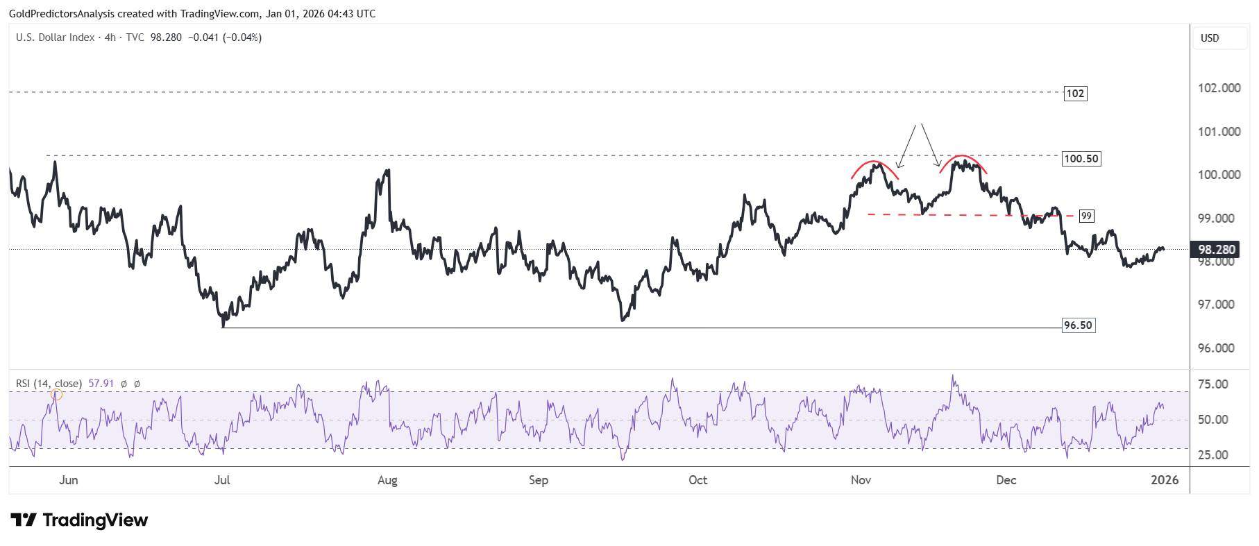 The 4 hour chart for U.S. Dollar Index shows the development of a double top pattern at 100.50 and then negative price action after breaking the 99.00 level. The strong consolidation between 96.50 and 100.50 means that the next major move in the U.S. Dollar Index will probably develop in the first quarter of 2026.