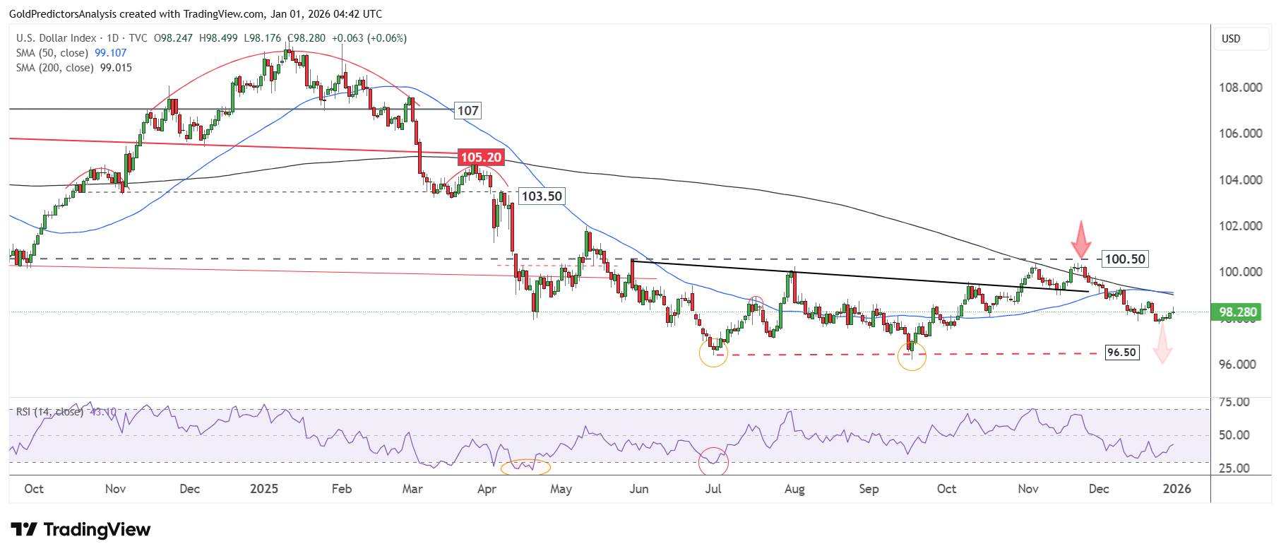 The daily chart of the U.S. Dollar Index shows that the index is moving around under thin liquidity conditions during the holiday period. Despite this fluctuation, the overall trend is bearish, and the index is likely to go lower in early 2026. A break below 96.50 would likely lead to a sharp drop in the U.S. Dollar Index to the 90.00 level.