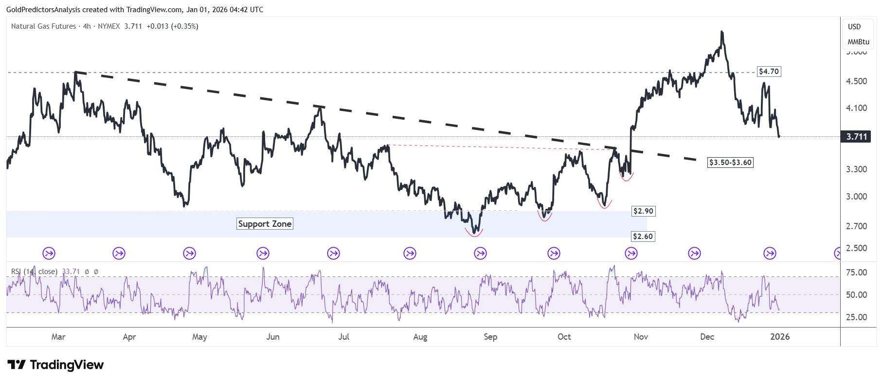 The 4-hour chart for natural gas also indicates that prices were unable to break above $4.70, which triggered negative momentum. The bearish nature of price action during the month of December indicates that 2026 may be a rough start with immediate support likely between the $3.50 to $3.00 area. A break below $2.50 would add to downside pressure in natural gas prices.