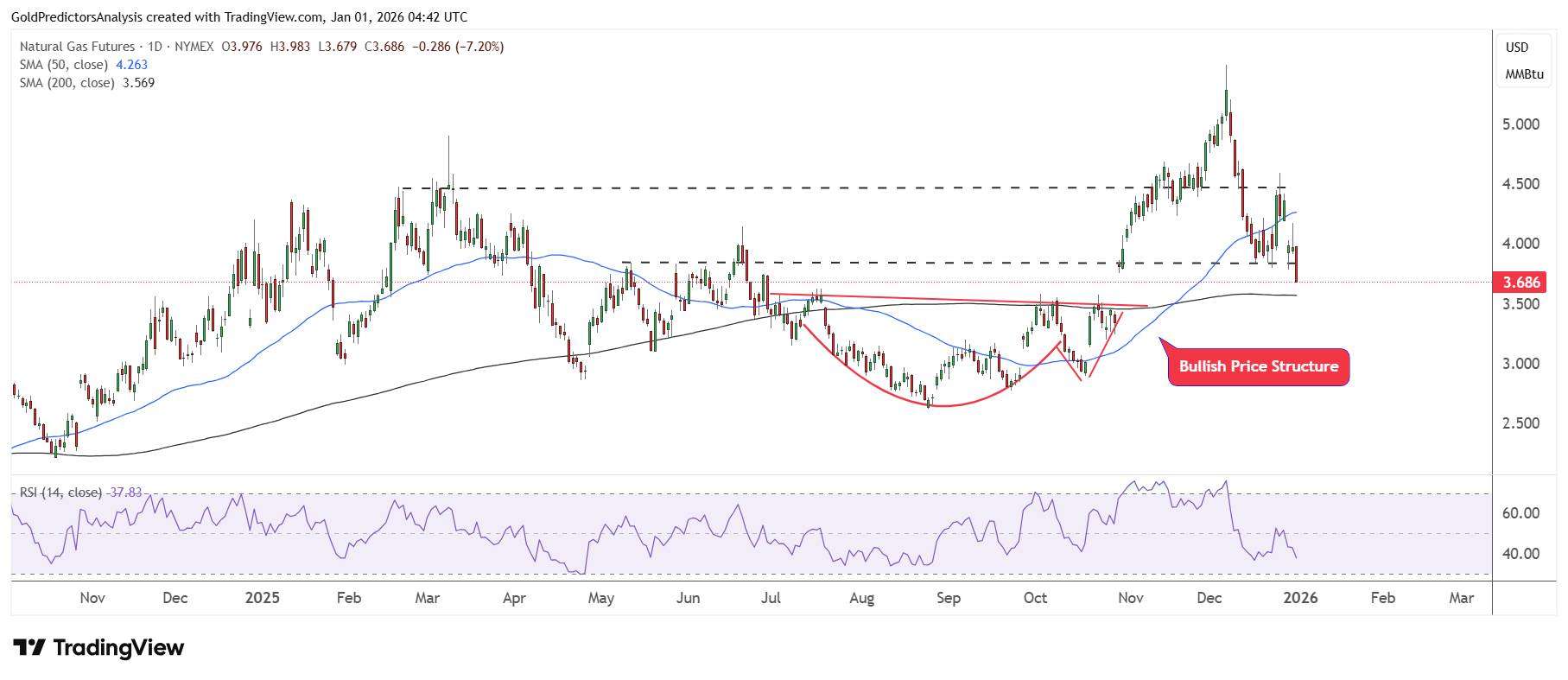 The daily chart for natural gas shows that natural gas prices moved between $4.50 to $3.80 before breaking lower. The natural gas price also fell on the last day of 2025, ending at $3.68. Immediate support is still in the vicinity of the $3.50 region at the 200-day SMA. However, the natural gas market is showing negative price action in the last month of 2025.