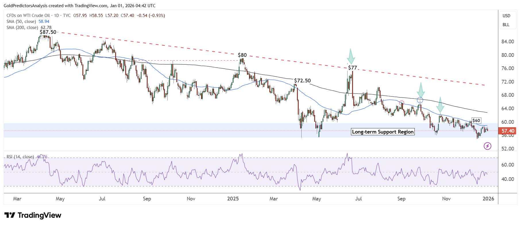 Oil prices dropped lower in 2025 and show bearish price action which indicates further downside in 2026. Brent crude oil (BCO) and WTI crude oil (CL) recorded almost a 20% drop in 2025. This was Brent's third consecutive annual loss, which is the largest losing streak on record. On the other hand, the market sentiment turned negative as supply concerns were affected by the geopolitical tensions. Brent oil closed the year at $61 while the WTI oil closed at $57.